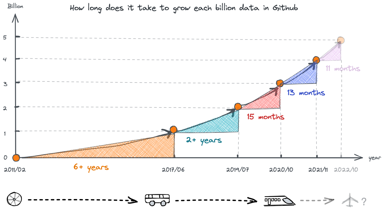 The figure below shows how long it takes to grow each billion events in GitHub.